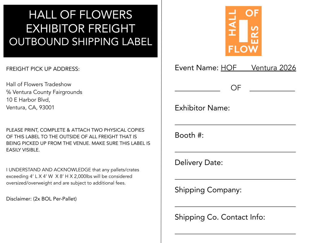 Hall of Flowers will provide empty labels to identify your crates & pallets for storage. All empty crates & pallets MUST BE labeled and placed in the aisle by 5PM on Monday. Crate/pallets with loose items will be treated as garbage & disposed of.