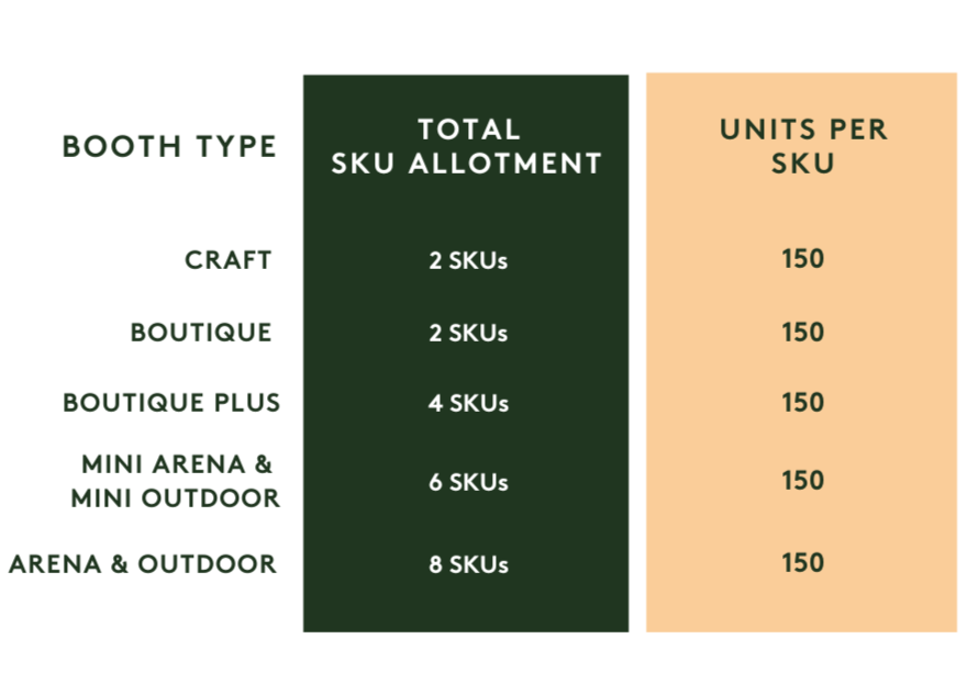 You may bring up to your maximum allotment limits as determined by your booth type (see chart below), however, we strongly recommend bringing only the quantity of product you realistically expect to sell during the two-day event.